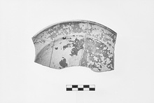 | Description: | Segment preserving ca. one-fourth of plate from rim to just above foot. Offset rim with concave upper surface. Soft, very micaceous clay, light gray (10YR 7/1). Shiny gray glaze, peeling body (7.5YR 5/?). | |