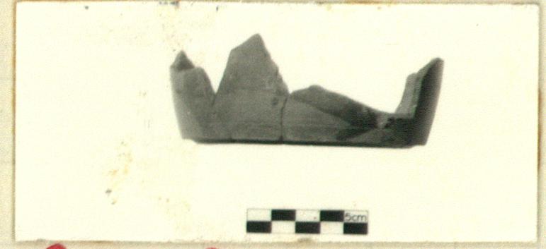 | Description: | Most of base (mended), part of neck, loose handle and body sherds. Near-cylindrical body, fairly low, with groove offset surrounding a flat base. Narrow cylindrical neck. Sliced handle, bearing two grooves. Thin orange ware with fine (gold) mica. Orange-brown slip on outside (patchy on bottom) and down inside of neck. Black staining on inside of body. Not local ware: cf. ATTIKΩ dish P 19372, or Knidian? | |