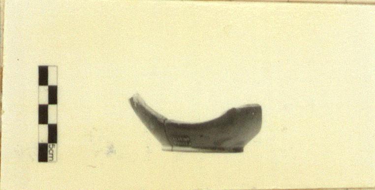 | Description: | Whole of base (two joining fragments). Lower part conical; flat base with small moulding, marked off by a groove on bottom. Gouged decoration on belly: remains of 2 sets of 3 oblique grooves. Thin smooth gray ware, glossy dark gray wash. Knidos (or Rimini?) ware. | |