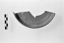 | Description: | One side, rim to base, mended from two pieces. Dish with low rounded wall and low foot. Pergamon (?) red gloss ware. | |