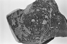 | Description: | Central part of floor, with stump of foot. Flattish floor, pedestal foot with mouldings; a raised band at base of wall on exterior. Band of fine rouletting on floor, between fine grooves. At center blurred two-line stamp: OPH ? EPM ? OY OY Light gray clay, flaking black slip. Eastern Sigillata B1. | |