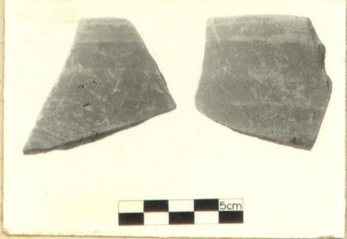 | Description: | Two non-joining fragments from rim and wall. Convex sloping wall with plain rim, slightly flattened on inside; edge of a flat(?) base. Gloss firm on inside, worn on outside. Unclassified (late?) shape. See P 27495-P 27497. Eastern Sigillata B2 ware. | |
