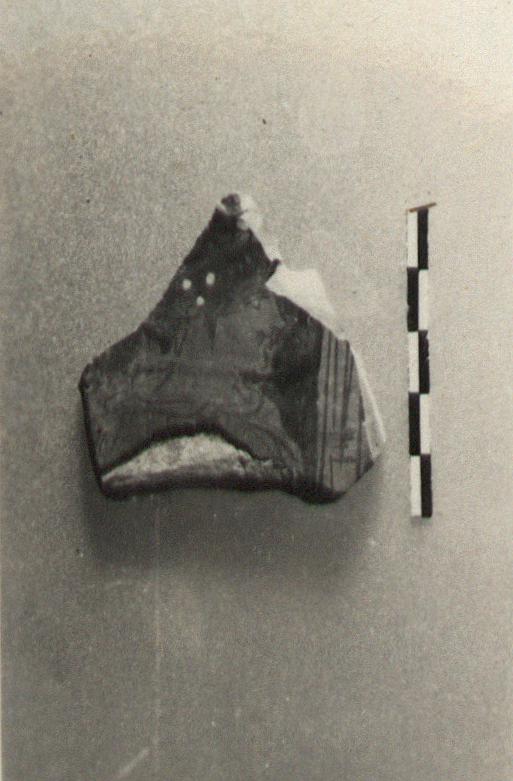 | Description: | From near the top of the wall; glazed red inside; the outside badly grayed, as if from burning. Woman's(?) head, right. A loose cloak around the shoulders, fastened by a brooch in front. A wreath, with white dots, in the hair. At the edge of the fragment, to the right, a torch. Relief contour for profile and nape. | |