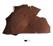 | Description: | Most of base and floor (mended from six fragments). Tiny foot, shallow curved floor. Four poorly impressed dolphin(?) stamps around center. Hard dull red ware, thin; red slip, smooth on interior. Phocean red slip ware. | |