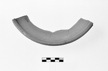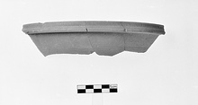 | Description: | Over one-third of rim (3 joining fragments). Sloping wall, thick low flanged rim. Faint rouletting (?) in hollow of rim. Hard dull red-brown clay with thin slip. Phocean red slip ware. | |