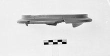 | Description: | Rather over half of rim and flange (4 joining fragments). Vertical tapered rim, sloping flange with rolled edge. Brick-red; red slip, ending under edge of flange. Carthage series. Hayes form 91c. African red slip ware. | |