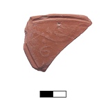 | Description: | Handle of small tray(?). Tip and attachment to vessel lost. A triangular flat plate with bowed sides. On top, shallow relief volutes flanking: <graphic> Grooves along edges. Smooth pink-red clay, red gloss. (Could be from a lamp-handle). | |