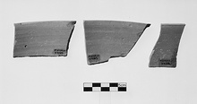 | Description: | Three non-joining rim fragments. Steep wall, narrow flat-topped rim. Orange-red ware and thin wash (redder on exterior). Line-polishing on interior. Minor spalling all over. Phocean red slip ware variant. | |