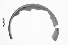 | Description: | Five rim fragments, four joining, giving greater part of rim and upper wall; base missing. Overhanging rim, shallow rounded bowl. No decoration. Thin, hard-fired dull purplish-red ware and slip; outside of rim unevenly discolored (gray, etc.) Hayes form 3C/E. Phocean red slip ware. | |