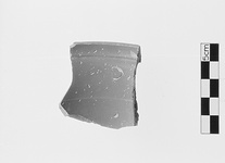 | Description: | Rim and wall fragment. Steep wall, hollow rim-band with flat exterior. Groove at mid-height on each face. Spatula marks on exterior. Red clay, good red gloss (flaked on rim-band). Consp. form 14/Haltern 7. Probably Arezzo ware, Italian Terra Sigillata. | |