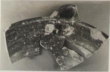| Description: | Mended from five pieces; none of the lower part preserved. The flaring sides straighten toward the top; the rim is a simple thickening, projecting slightly on the outside. Blunt rounded spout, bridged by rim. Heavy fabric; pinkish buff clay. Reddish brown to black glaze on the inside, on the outside to just below the rim, and for a broad band around the body below the spout, and all over the spout. | |