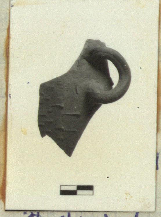 Description:   Belly fragment with a handle. Rounded (hemispherical?) body with stump of an outcurved rim. A V-shaped handle, twisted up vertically, set against top of body. On outside, below handle-level, rows of barbotine 'thorns' (parts of 4 rows visible).