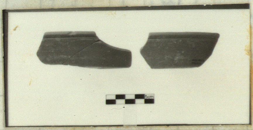 | Description: | Two pieces of rim and wall (three sherds). Steep sloping wall, with a plain rim marked off by groove; edge of a flat floor preserved. Fairly thin walled. Fine orange ware (mica traces); red slip, thin and dull on outside, glossy (but worn at top) on inside. Probably Pergamon ware, Loeschcke. (Candarli) form 26A. | |