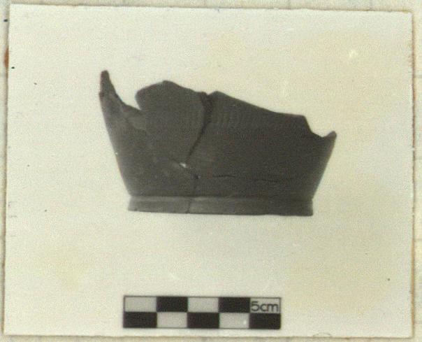 | Description: | Mended from four pieces: almost all of base and part of lower wall. Small base-molding/foot marked off above by groove, below by an offset; base flat. Steep-sided body, bearing multiple rouletting, with a plain band below. Thin brown ware with fine mica; exterior gray at top. Asia Minor series? | |
