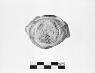 | Description: | Edge of floor of basin (or of shoulder of large closed form), with body angle. At the angle, stump of a thick round-sectioned foot or handle, with surrounding ring at junction with body. Buff clay with slight inclusions; patches of olive-green glaze on inside, worn remains of whitish to dark green-blue glaze on outside. Possibly Mesopotamian/Tarsus fabric. | |
