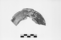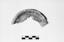 Description:   Three joining fragments, giving one side, from rim to base; central area lost. Flattish floor; vertical rim with broad flanges at rim and bottom; remains of a low foot. Fine grooving on inside, under lower flange and inside foot.