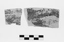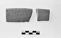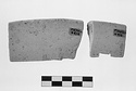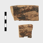 | Description: | Two non-joining fragments perhaps cut from pot and re-formed to current shape. Clearly not a handle, the fragments resemble a rim, but of an unidentified form. Clay body and reserved surfaces evenly fired close to pink 7.5YR 7/4. Paint on one side of both fragments applied in irregular fashion, much streaked. Paint mottled reddish brown to black (black where thickest). AS 877 a, b. | |