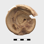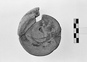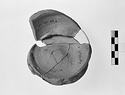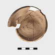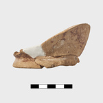 | Description: | Vessel broken during manufacture and subsequently reused as test piece. Five joining fragments preserving base and portion of lower body of closed vessel. Vessel clearly broken during manufacture on wheel. Disk base, pushed up on underside; lower wall rising steeply. Irregularly applied paint over part of lower wall and on underside. Paint fired reddish purple. Clay body and reserved surfaces evenly fired close to pink 5YR 7/3. Agora Sample no. 882. | |