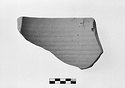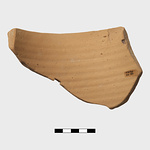 | Description: | Single fragment preserving large part of test piece, including top and portion of both side edges. Piece cut from the neck of a large closed vessel. Traces of paint, poorly preserved and mostly worn, on exterior. Interior evidently reserved. Paint on exterior fired red, as is that on top edge. Clay core and surfaces fired close to pink 7.5YR 7/4. | |