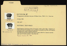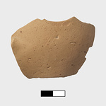 | Description: | Single fragment preserving portion of test piece, with no clear edges. Fragment, cut from lower body of small open vessel, preserves lower stump of handle attachment. Probably from a one-handled cup rather than a skyphos. Clay body and reserved surfaces fired close to pink 7.5YR 7/4. Exterior reserved; upper part of interior painted. Paint fired red. | |
