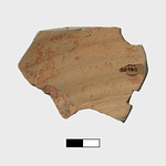 | Description: | Single fragment preserving portion of test piece, including almost one-third of draw hole. Piece cut from the shoulder of a large closed vessel (rather than from the body of an open pot). Edge, opposite draw hole, also preserved. Exterior reserved, except perhaps for minute dribbles of paint. Interior painted with vertically and horizontally intersecting lines. Paint extends over one edge and one side of draw hole. Clay core fired light gray, in the range of 7.5YR 7/2-6/2, N7/-N6/. Reserved exterior surface fired close to pink 7.5YR 7/4. Piece removed from kiln during early stages of re-oxidization. | |