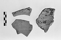Description:   Single fragment preserving small portion of test piece. Fragment cut from the shoulder, at junction with neck, of a large closed vessel, probably an amphora. No clear edges preserved, though some of the breaks seem very regular. Preserved paint on interior and exterior thickly applied, fired black. Exterior canonically decorated: broad band at juncture of shoulder and neck, below which is outer arc of compass-drawn circles. To right, vertical wavy line and four vertical stripes (necklace pattern). Paint on interior worn, and mostly flaked; interior painted solidly, except for upper part of fragment (non-canonical).