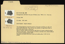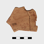 | Description: | Two joining fragments preserving portion of test piece including one edge and almost half of draw hole. Piece cut from the shoulder of a large closed vessel or from the lower body of an open or closed pot. Paint on interior, exterior and preserved edge fired red. Interior evidently painted solidly, but much worn. Traces of paint on exterior, extremely worn; scheme difficult to reconstruct (perhaps painted solidly?). Clay body and surfaces fired close to pink and reddish-yellow 7.5YR 7/4-7/6. | |