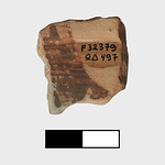 | Description: | Single fragment preserving very small portion of test piece. Fragment from body of undetermined vessel (perhaps closed?). Exterior canonically decorated: portion of one set of compass-drawn circles above, partially overlapping with broad band below. Paint fired black where thickest; red where dilute on circle. Irregular sweep of paint on interior, mottled red and black. Clay body fired light gray at points; elsewhere clay body and surfaces fired close to pink 7.5YR 7/4. | |