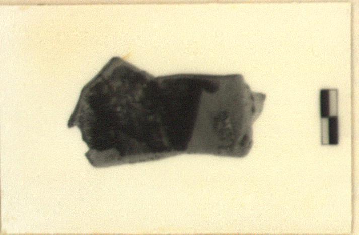 | Description: | Single fragment preserving portion of test piece, including part of draw hole rather than edge. Piece cut from a vessel as P 32380, including portion of handle stump. Paint on interior, exterior and draw hole edge fired black; dark brown where dilute. Portion of two diagonal stripes below handle on exterior; broad sweep of paint on interior. Clay body and reserved surfaces evenly fired close to pink 7.5YR 7/4. | |