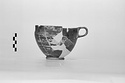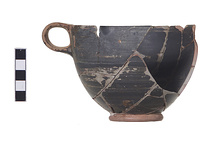 | Description: | Mended from many pieces; about one half, including full profile, preserved. Plain disk foot, high convex walls, single vertical strap handle attached to rim at top. Traces of a second handle implied by crescent break at rim opposite? Vertical or horizontal? Reserved: all of base. Rest covered in a poor streaky black glaze. Many of the pieces gray in color, from fire after breaking? No real parallel in Agora XII, but similar, except for foot, to no. 360. ADDENDA Pattern of streaky glaze indicates that the second handle had to be horizontal. Added red, double line on interior of rim; double line at handle attachment on exterior. (KM 2/99) | |