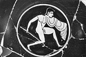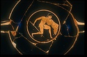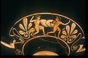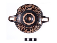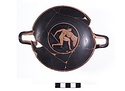 On the other side a nude youth, holding an undecorated shield and his right arm held high, advances to right, toward a second youth seen in three-quarter frontal view who is retreating right, holding a shield decorated with an animal, apparently a horse, possibly intended to be a panther. Second youth is also nude and also holds his right arm high, as though grasping a spear.