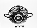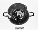 Torus foot, rising underneath, continuous curve to body outside. Broad, shallow bowl, plain lip. Curving, canted horseshoe handles. Reserved: deep interior of bottom, resting surface and outer face of foot, line halfway up body, inside and outside lip, within handles, and circle within forming tondo. Red-figured design outside and inside. Hasty style, and proportions of figures almost cartoon-like. Inside: a youth, nude except for a cloak draped over the left arm and shoulder, moves right, holding a long crooked stick or staff in his right hand. Outside: tendrils coiled beneath handles lead to 5- or 6-leaved palmettes which frame scenes of youths-unarmed except for shields, in combat. On one side a nude youth holding a shield decorated with a dot rosette, advances to the right, his right hand held low as though grasping a spear. To his right, a second youth seen in rear view retreats to the right, holding a shield decorated with a feline (panther?) and wearing a cloth of some sort from waist to just above knees. His right hand, too, is bent and held low.