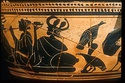 Side B: Similar scene to side A, but left banqueter largely missing. Central figure sits left holding a lyre. Added white and lack of incision indicate a female, with hair bound up.