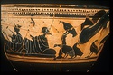 Framing scenes and under handles, are numerous large, plump, long-necked birds in pairs or trios: ravens? ducks? geese? Several stand on stumps, suggesting landscape and an outdoor banquet, as does the single small bird in flight to the right of the lyre player's head on side B. On side B, the glaze quite worn up near the top.