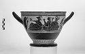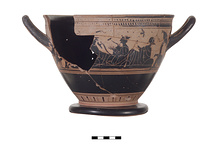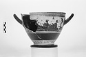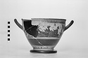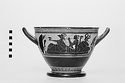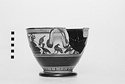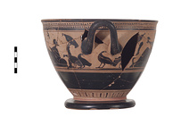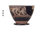 Description:   Mended; almost complete, except for parts of rim and body. Attic type skyphos. Strong torus foot, deep body, slightly out-turned concave lip, canted horseshoe handles.