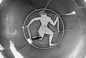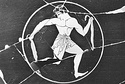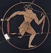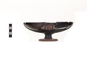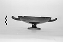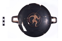 | Description: | Mended from several fragments; complete except for part of rim and bowl. Right leg of figure missing. Plain rim. Torus foot, concave at upper edge, rising within. Thick stem with fillet at juncture with foot, offset with two scraped grooves. Broad bowl, plain lip, two canted horseshoe handles. Reserved: center of cone within, resting surface, outer face of foot, scraped grooves on stem, inside of handles and handle panels. Good black glaze. Shape close to Agora XII, no. 420, 500-480 B.C. cf. also P 32420. Decoration: Tondo within defined by a thin reserved line. Within tondo a youth moves rapidly to the right, holding in each outstretched hand a long strip, perhaps a strip of meat. Legs are seen in profile, abdomen in three-quarters view, and chest frontal. Head turned back toward the left, seen in profile. A piece of drapery is knotted at the waist and hangs down a short way, leaving the genitals exposed. Short hair; almond eye closed at both ends, with a solid dot for the pupil. Fully glazed line for main details of torso and folds of drapery. Dilute glaze for nipples, muscles of abdomen, and area of ribs. No details for legs or feet except toes of right foot. Added red on the two long strips, which have curving ends at top. Ghost image of painted inscription clockwise from the head of the youth: D. von Bothmer, August 1995: close to Skythes. | |