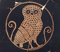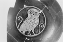 Decoration within: Tondo of reserved line, with owl and tendrils within. Owl stands right, spotted except for wing feathers. Simple tendrils on either side. Ghost image of curving leaves and letters discernable to right of owl: