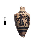 | Description: | Body of small lekythos preserved, missing foot, handle and mouth. Painted scene of front only: maenad between two satyrs. She moves right, looking back over her shoulder at satyr grasping her arm. Second satyr approaches from right. Branches in background. Use of incision, no added red or white survives. Rays on shoulder. Class of Athens 581, ii, cf. Agora XXIII, nos. 1079-1087, early 5th. B.C. | |