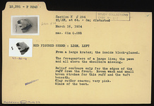 | Description: | From a large krater; the inside black glazed. The forequarters of a large lion; the paws and all above the shoulders missing. Relief contours only for the edges of the ruff down the front. Brown wash and small brown strokes for this ruff and the tuft beneath. Clay rather coarse; very pink. The best glaze. | |