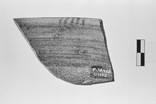 | Description: | Single fragment preserving portion of rim and upper body of kotyle similar but different to P 32437. Fragment significantly distorted due to heat. Interior painted except for preserved band at lip, decorated with one preserved set of five vertical strokes. Paint on exterior much worn. Lower wall painted. Area above evidently decorated with horizontal bands, mostly not preserved. Rim decorated with vertical stripes and lozenge chain. Two thin bands at lip. Paint fired dark brown approaching black. Reserved surfaces fired close to light brown and pink 7.5YR 6/4-7/4. | |
