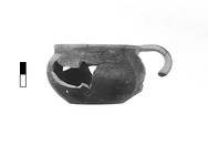 | Description: | Mended from many fragments, almost complete. Flat base; curved body; short vertical rim. Paint black; body painted solid; reserved band on exterior rim; handle banded. Interior painted except for reserved band at rim and dot at center of floor. Clay pink to light brown 7.5YR 7/4-6/4 where not fire-affected. | |
