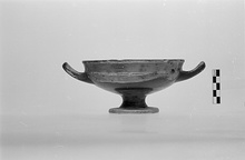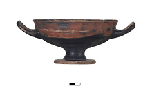 Description:   Mended from twelve pieces. Complete except for fragments of wall and chips of rim. Disk foot, rising within, thick stem with bulge at juncture with foot, offset concave lip. Dull black glaze, fired reddish brown in places. Reserved: center of underside, resting surface, outer torus of foot, inner part of handles and handle panels.