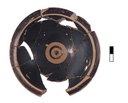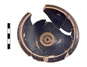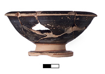 Description:   Mended from twelve fragments. Almost complete. Flat disk foot with rising cone in center, vertical face, low stem, rim thickened and sloping down on outside. Reserved: underside of foot except for band of glaze within cone, face of foot, stem, both edges of rim, center within except for glazed circle and dot.