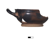 | Description: | Almost half preserved, with one handle and full profile. Spreading ring foot, concave lip. Reserved: underside of foot except for large central dot, outside of foot, inner part of handle and handle panel. Mottled black glaze. Dark, orangey clay. Similar to P 32482 (ca. 500-480 B.C). | |