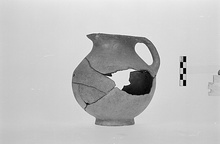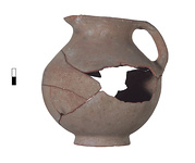 Description:   Mended from five pieces. Some large body fragments missing. Flaring ring foot, squat body, broad neck, trefoil mouth.