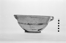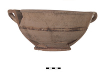 | Description: | Mended from fourteen fragments. Sections of rim and body mising and half of each handle. Flaring ring foot, open bowl, thickened rim flat on top. Horizontal handles, round in section, tangent to rim. Thin brown wash on outside of foot, around body in band at base of handles, on handles, and within basin. | |