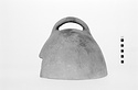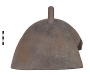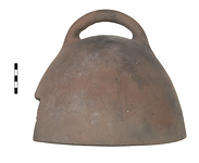 | Description: | Two-thirds preserved. Large part of bottom missing. Bell-shaped cover to fit over a pot on brazier; loop handle round in section across top. Flat resting surface at bottom. Dark orange cooking ware fabric with numerous small inclusions and mica. Traces of burning inside and out. Cf. Agora XII, no. 2021 (520-490 B.C). | |