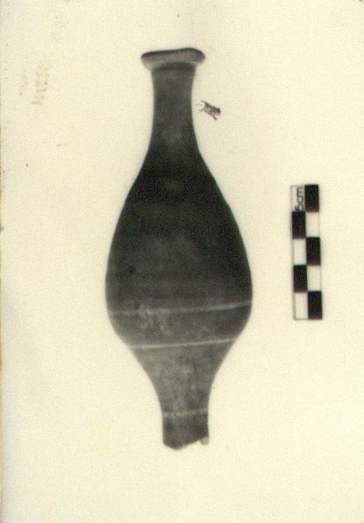 | Description: | Mouth and top neck missing. Foot offset by groove, slightly concave underneath. Solid stem. Bulbous body. Fusiform shape. White stripe on belly, shoulder, and neck. Fabric has gray surface, red core (ca. 10R 6/8). | |