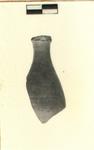 | Description: | Neck, mouth, shoulder and half of belly missing. Fusiform shape. Foot chipped. Rough, slightly concave underside. Hollow stem. Faded white stripe on belly. Gray clay. | |