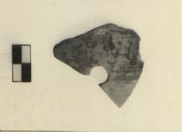 Description:   Single fragment preserving portion of test-piece, including three-quarters of draw-hole and parts of three edges. Piece probably cut from lower body of open vessel. Paint on interior most fired red; red-black on exterior. Painted solid on both sides.